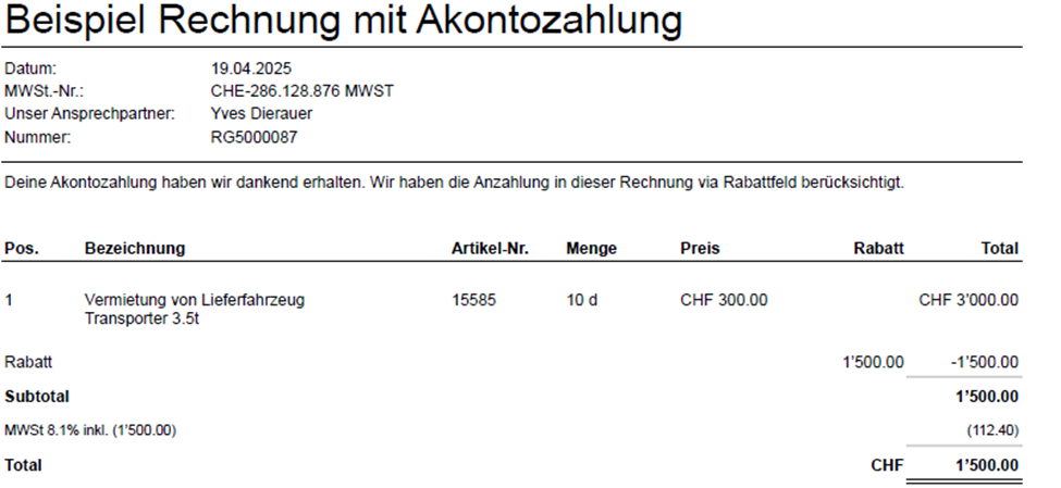Erwähne im Einleitungstext, dass die Akontozahlung bereits geleistet wurde und ziehe diese via Rabattfeld ab.
