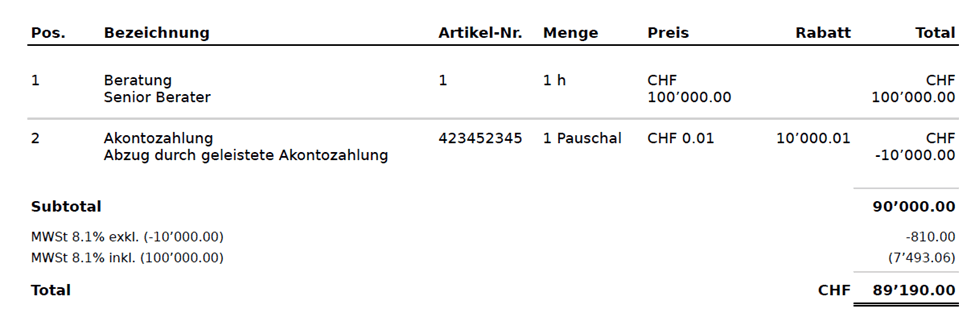 Erfasse ein Produkt namens „Akontozahlung“. Füge diese Position hinzu mit dem preis / menge 0.01.-. Füge dann einen Rabatt auf dieser Position von zum Beispiel 10’000.01 hinzu. So kommen die 10’000 als Minusposition.