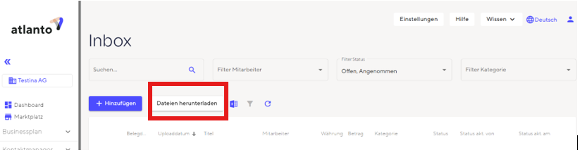 Es können jederzeit alle Belege aus der Inbox heruntergeladen werden. Beachte, dass nur Belege aus der Inbox dabei sind. Solltest du Belege manuell bei den Verbindlichkeiten oder bei den Buchungen hinzufügen, musst du diese alle einzeln und manuell herunterladen. Wir empfehlen dir darum, immer über die Inbox zu arbeiten.