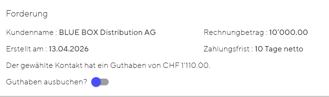 Du kannst alternativ bei zu viel bezahlten Beträgen diesen auch direkt bei der Ausbuchung der Forderung eingeben. Klicke bei der Forderung auf die drei Punkte, dann «offene Position begleichen», beim Feld «erhaltener Betrag» trägst du den totalen Betrag ein. Es wird ein Guthabenkonto für den Kunden geführt, das bei der Verbuchung der nächsten Rechnung wieder verwendet werden kann.