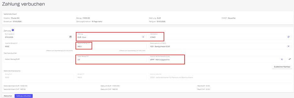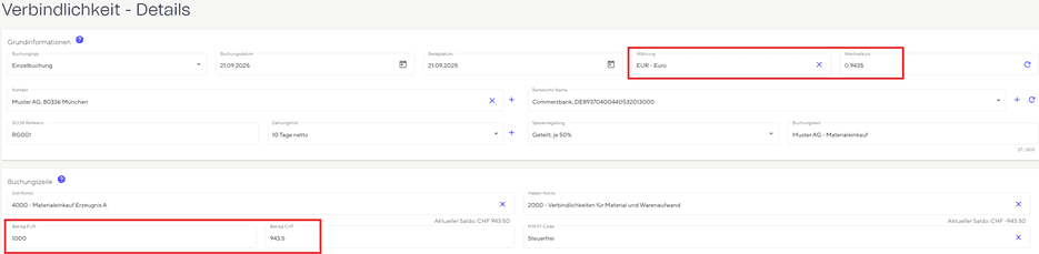 Wie man im Screenshot sehen kann, wird der Betrag von 1’000 EUR automatisch mit dem tagesaktuellen Kurs in 943.50 CHF umgerechnet.