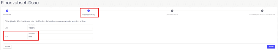Zum Jahresabschluss hast du nun einen Saldo von 1’000 EUR auf dem Bankkonto. Da der Jahresabschluss in CHF ist, muss dieser Saldo bewertet werden. Dies kannst du im Rahmen des Jahresabschlusses machen. Du kannst den Kurs eingeben, zu welchem Atlanto den Bestand in EUR bewerten soll. Die Buchungen werden automatisch gemacht.