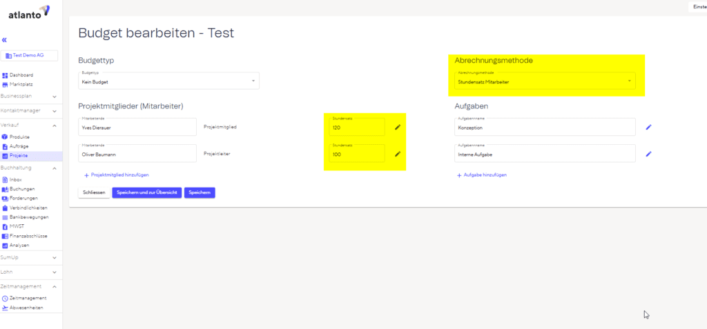 Du rechnest ein Projekt zum Beispiel je Monat ab und möchtest für die einzelnen Mitarbeitenden individuelle Stundensätze hinterlegen. Es gibt in Atlanto zwei Arten von Stundensätzen: Interne und Externe.