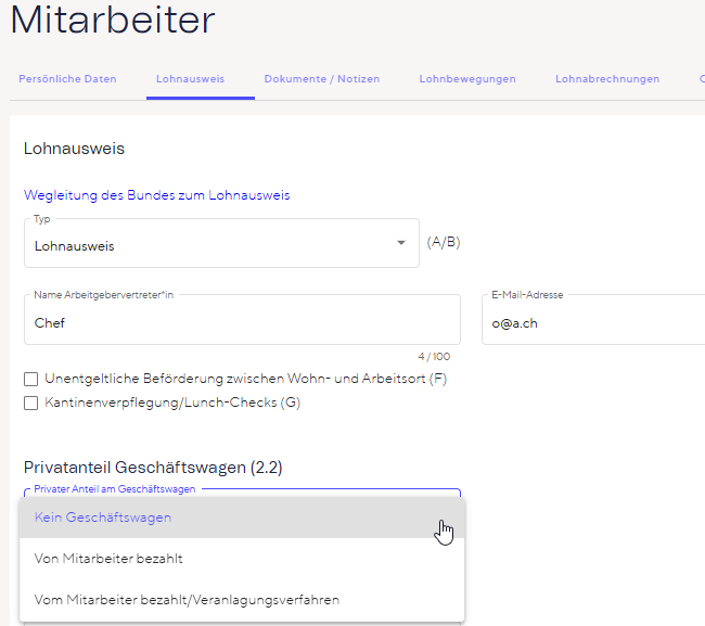 Der Privatanteil wird in Feld 2.2 (“Privatanteil Geschäftswagen”) des Lohnausweises eingetragen.