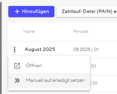 Es gibt zwei Möglichkeiten, die Zahlung des Lohnlaufes zu verbuchen. Entweder du lädst die camt-Datei hoch oder du setzt den Lohnlauf manuell auf erledigt.