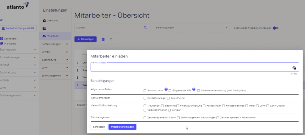 Unter Einstellungen/Mitarbeiter kannst du Personen für deinen Account berechtigen (z.B. Mitarbeiter oder Treuhänder). Du kannst dort die Mail-Adresse eingeben und die Häkchen bei den gewünschten Modulen setzen. Achtung, bei mehr als 3 User entstehen Zusatzkosten (siehe https://atlanto.ch/de/preisgestaltung/). In diesem Bereich handelt es sich um User.