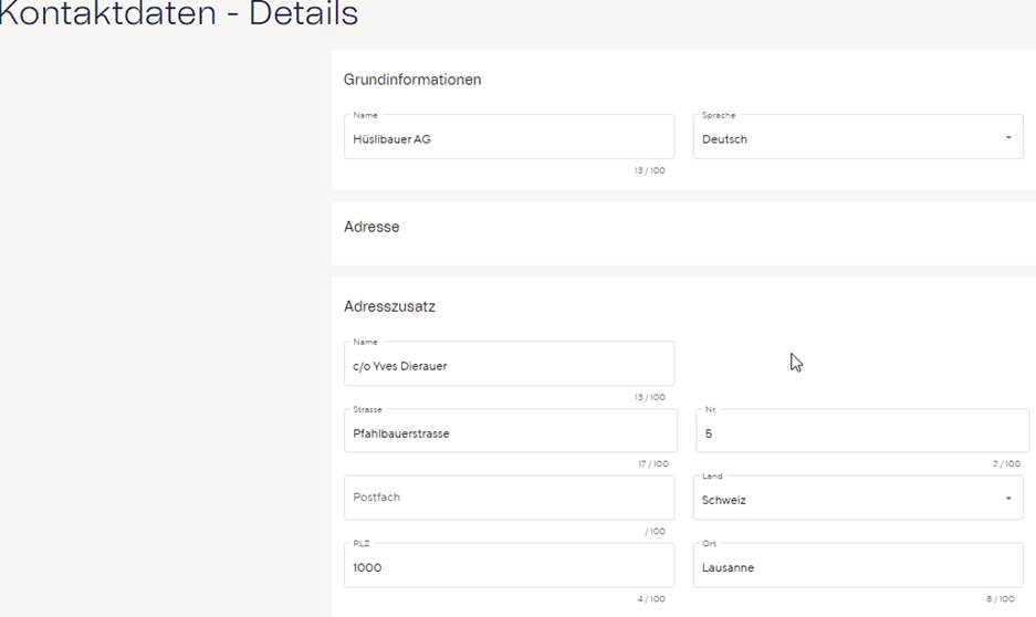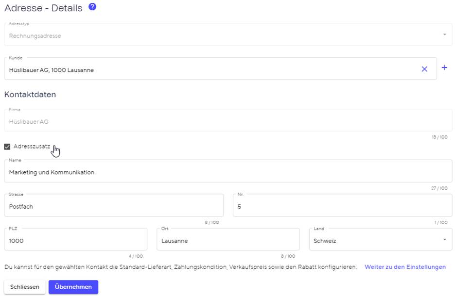 Du kannst den Adresszusatz erfassen, indem du einen Kontakt öffnest, dann «Bearbeiten» klickst und in der dritten Box den Adresszusatz erfasst.