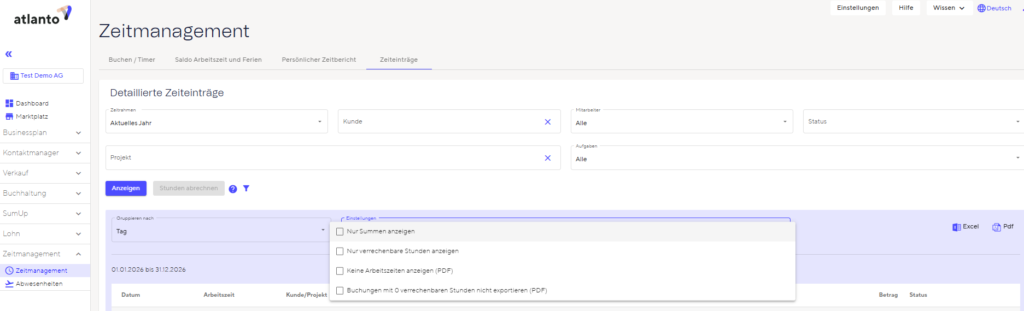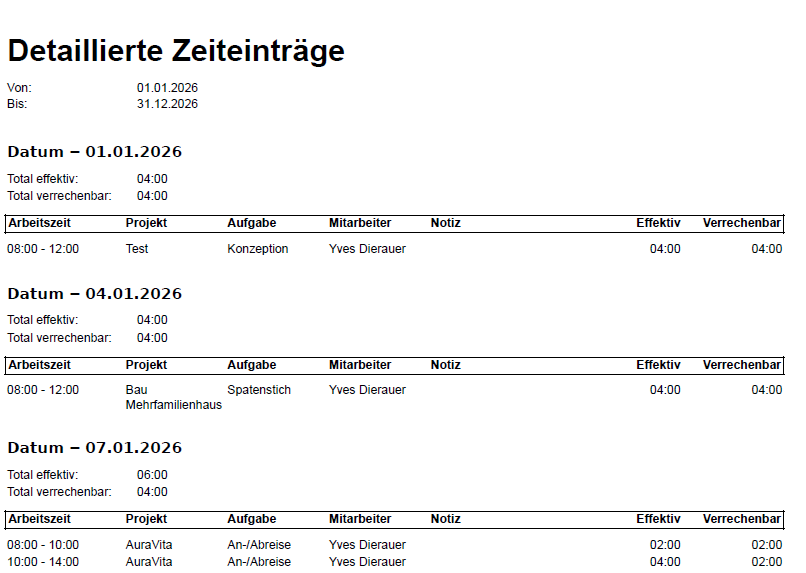 Grafisch haben wir den Report neu strukturiert und übersichtlicher gestaltet. Es wird zum Beispiel nicht mehr pro Datum extra eine neue Seite produziert. Zudem können umfassende Filteroptionen genutzt werden. So können zum Beispiel verrechenbare oder effektive Zeiten ein- oder ausgeblendet werden.