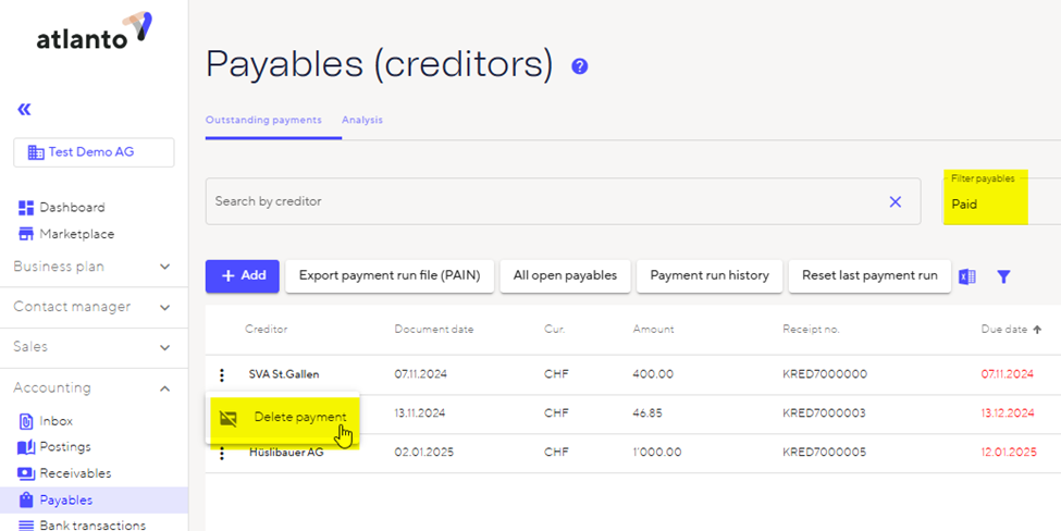 2.    Payments have been deleted (not necessary if agreed): To do this, go to Receivables or Payables, click on the three dots to the left of the payable/receivable and then “delete payment.”