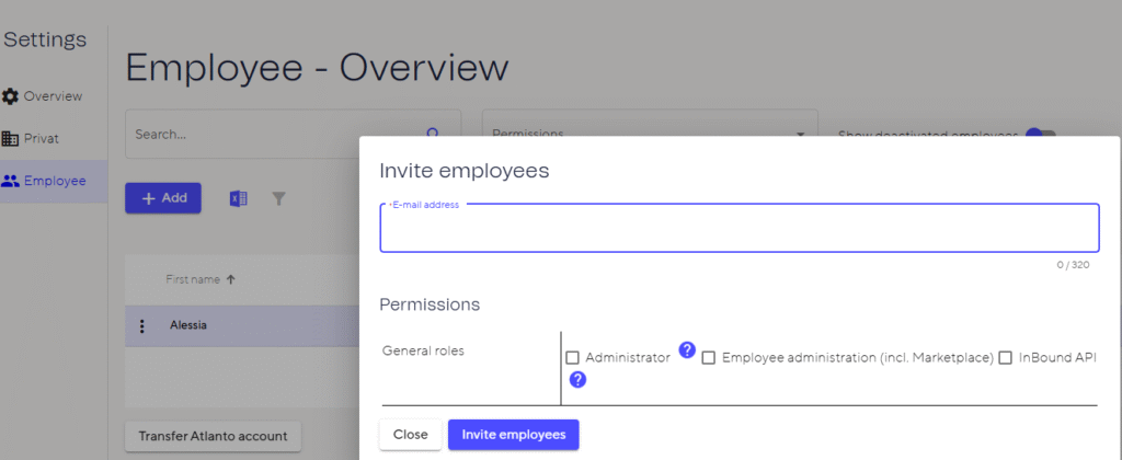 When you add a user in the Permission Management and tick at least “Time Management – Posting”, Atlanto automatically creates a profile for this user under Settings / Time Management / Employment Relationships.
