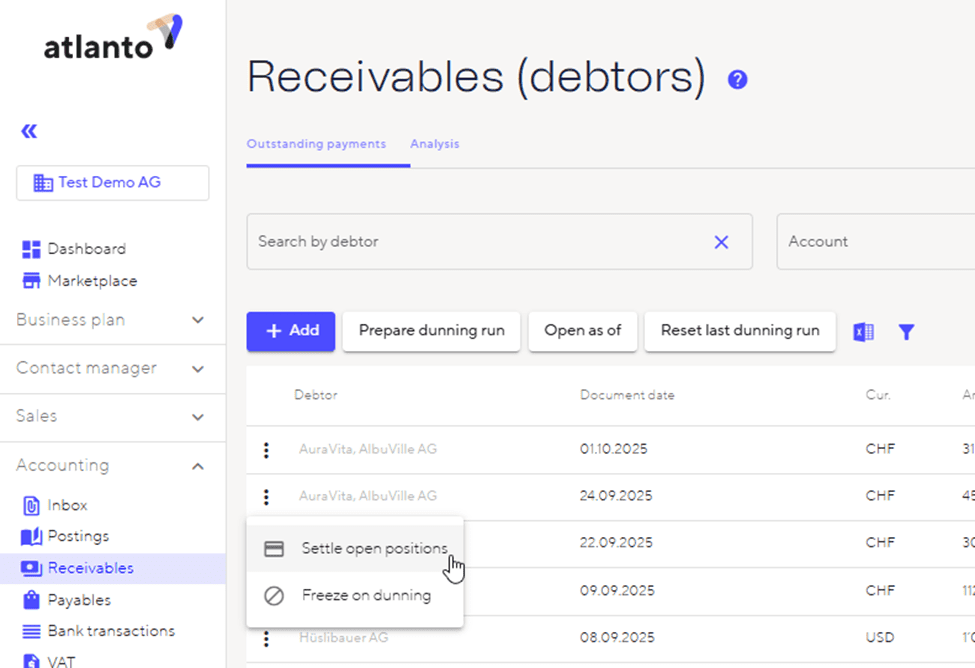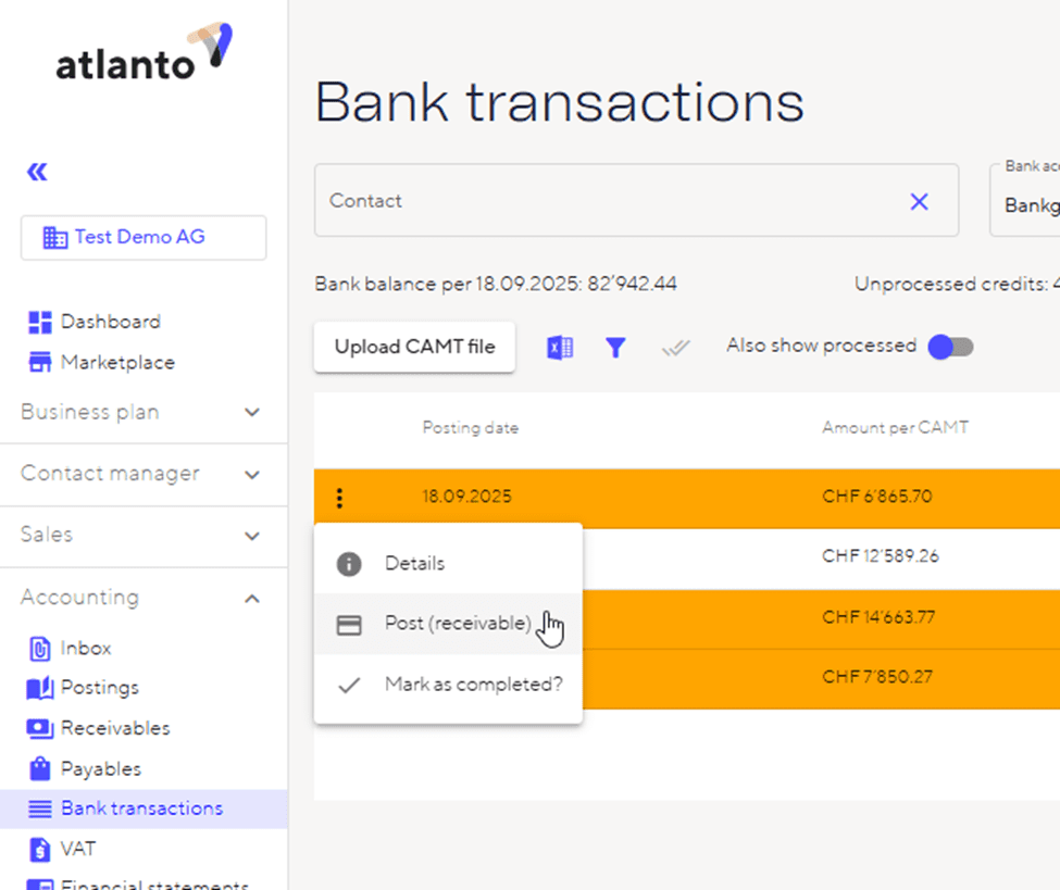You can find these in Atlanto under bank transactions and match them with the receivable. Go to Accounting/Bank transactions, select the corresponding account receipt and choose ‘Post (receivable)’.