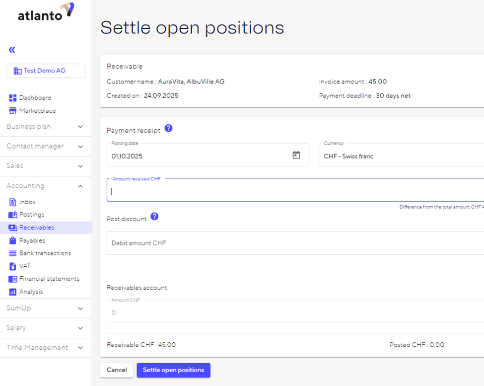Atlanto does not have a specific function for partial payments. It is not possible to generate two payment slips for the same invoice, nor are structured receivables created in the accounting.