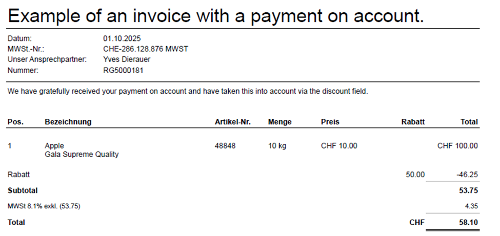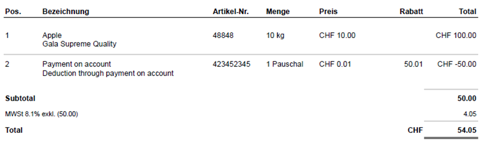 Enter a product called ‘payment on account’. Add this item with the price/quantity 0.01. Then add a discount to this item of, for example, 50.-. This will result in the 50.- being a negative position.