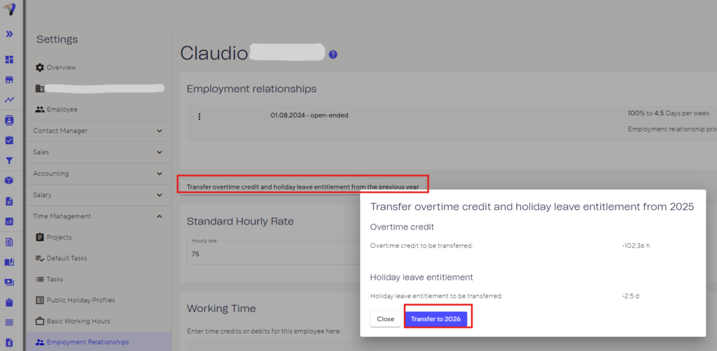 To ensure that vacation and time balances from the previous year are carried over correctly, you must manually enter them for each employee at the beginning of the new year. The transfer is done directly in the respective employee profile.