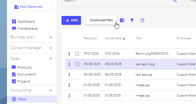 You can also download the tickets and invoices from the inbox. Please note that only receipts that have been uploaded to the inbox will be included. If you have added receipts manually under ‘Payables’ or ‘Postings’, you will need to download these individually and manually out of each posting.