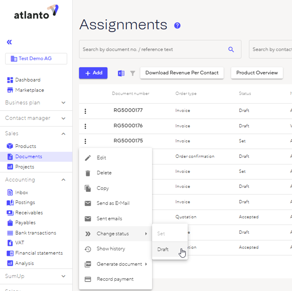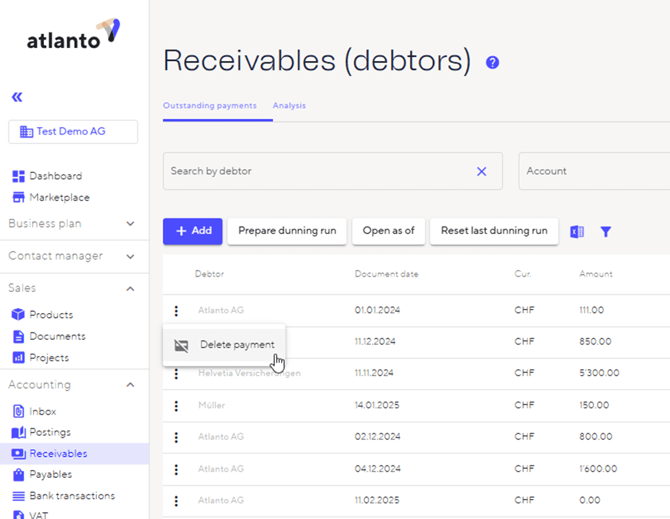 If you have already posted a payment for the receivable (via bank transactions or manually via “Settle open positions”), you must first delete the payment. You can then adjust the status of the invoice again.