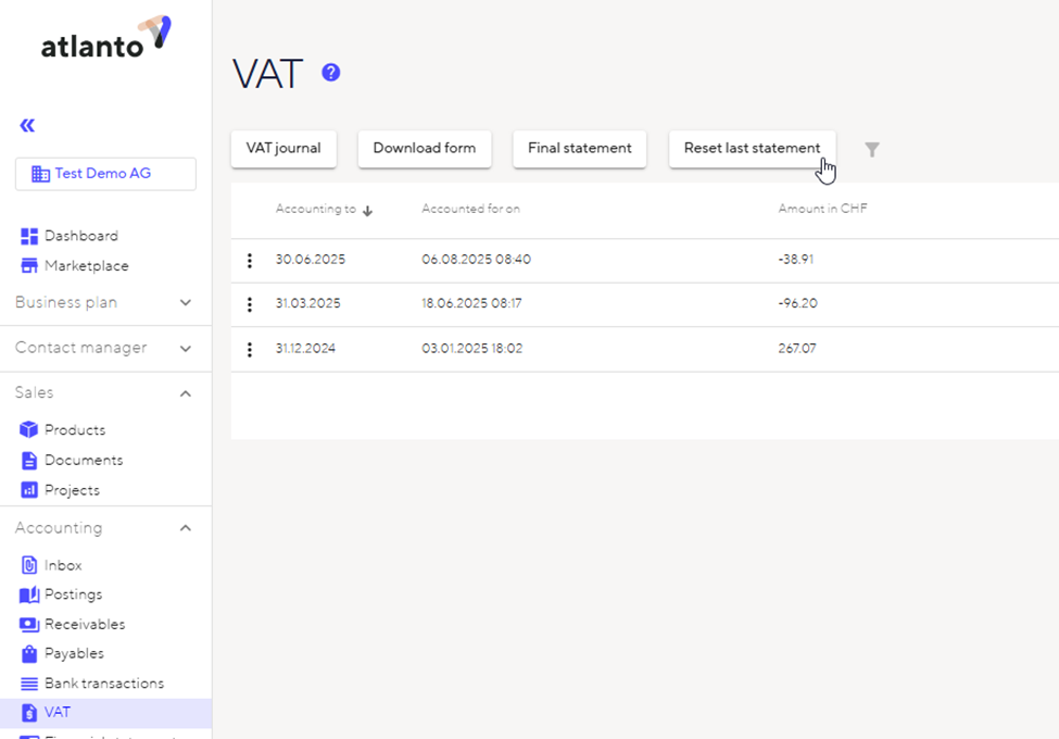 If the VAT period for the date of the invoice is already finalized, you must reset it. To do this, go to Accounting/VAT and select “Reset last statement”.