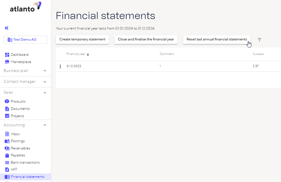 If the fiscal year for the date of the invoice is already definitively closed, you must reset it. To do this, go to Accounting/Financial statements and select “Reset last annual financial statements”