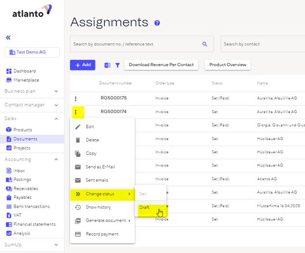 For further adjustments, you must reset the invoice to ‘draft’ status. To do this, go to Sales/documents, select the three dots on the far left and then click on ‘Change status’.