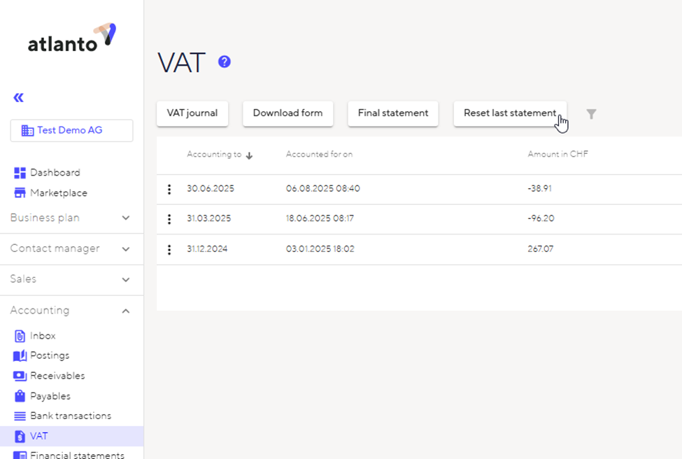 If a VAT statement has already been created for the corresponding period, the posting cannot be edited. You must first reset the last statement. To do this, go to Accounting/VAT and select ‘Reset last statement’.