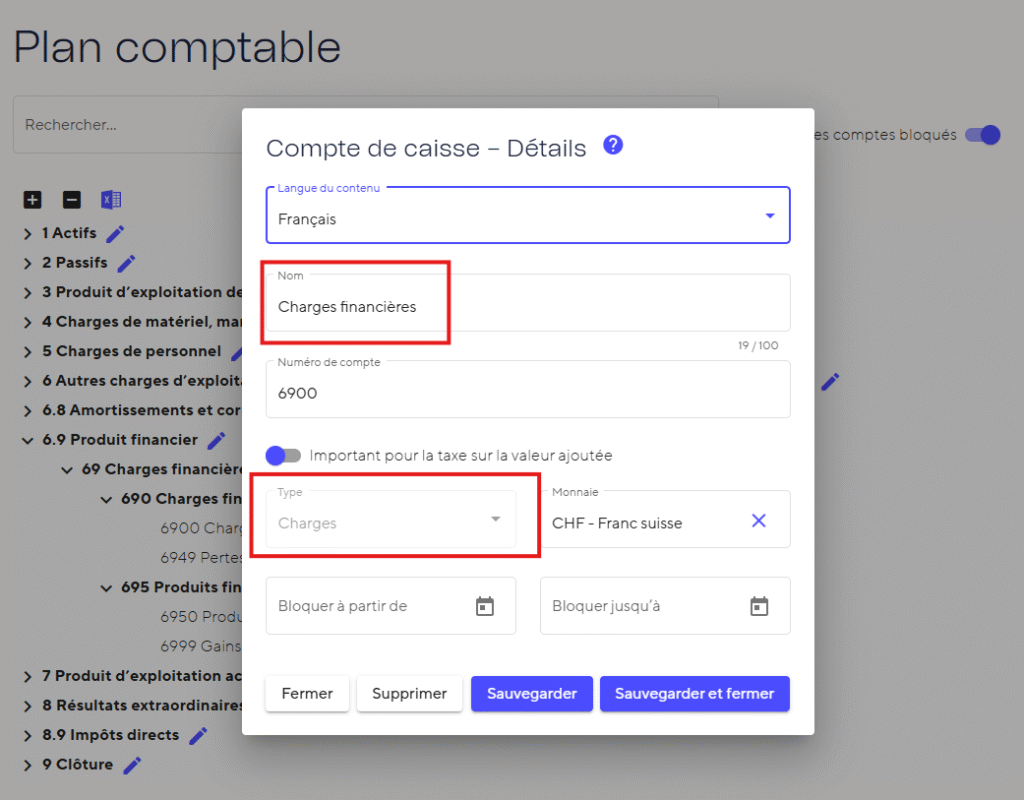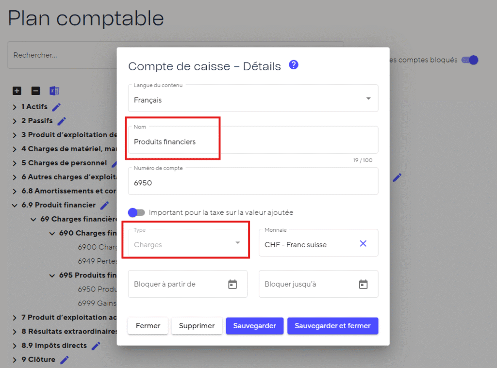 Les classes de comptes sont prédéfinies comme comptes de charges ou comptes de produits. Ce paramètre détermine si le montant est affiché comme positif ou négatif dans le compte de résultat et ne peut pas être modifié.