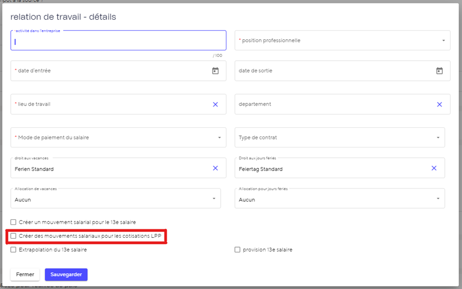 Les mouvements salariaux LPP peuvent être enregistrés automatiquement lors de la création du contrat de travail. Si tu coches la case « Créer un mouvement salarial LPP », tu peux saisir directement le montant des cotisations salariales et patronales. Les mouvements salariaux sont ensuite enregistrés automatiquement.