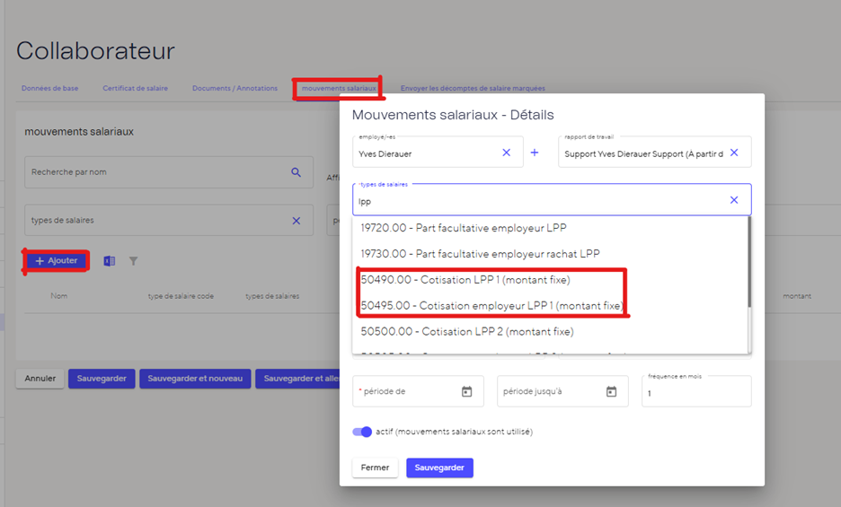 Si tu ne l’as pas fait, tu peux ajouter les mouvements de salaire manuellement. Accède aux mouvements de salaire de l’employé×e concerné et ajoute-les manuellement. Note que tu dois saisir le mouvement de salaire pour les cotisations patronales et salariales.