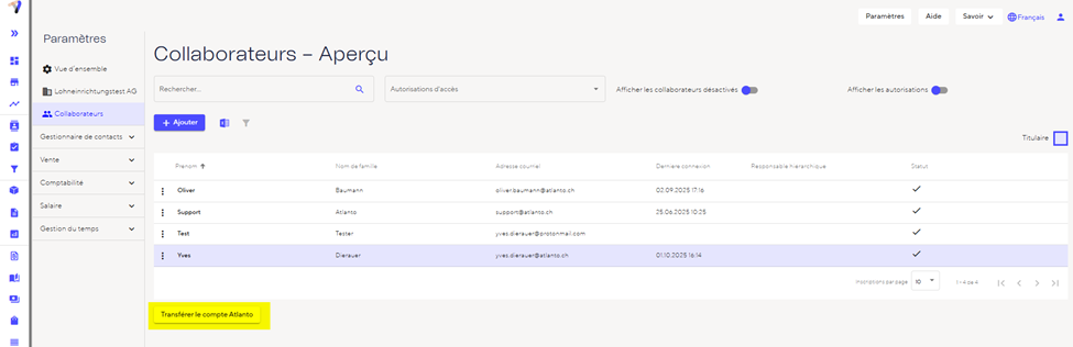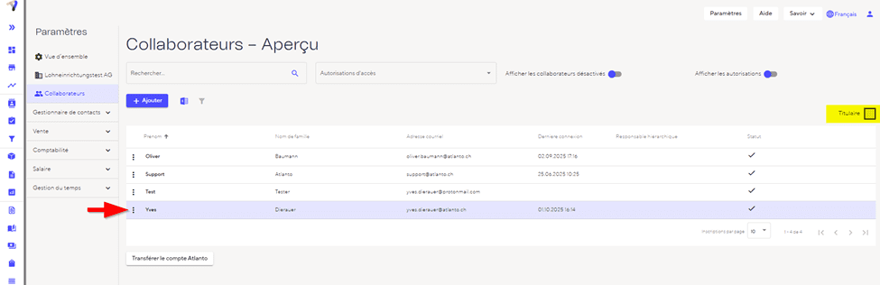 Une fois l’adresse e-mail est confirmée, tu peux à nouveau transférer le titulaire à la nouvelle adresse sous Paramètres/Collaborateurs via le bouton. Tu peux désormais désactiver l’ancienne adresse e-mail en cliquant sur les trois points à gauche.