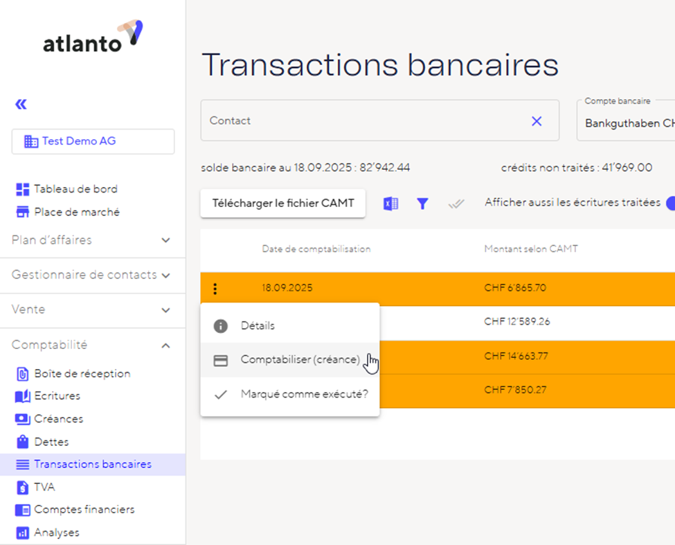 Vous les trouverez dans Atlanto sous « transactions bancaires » et vous les rapprocherez à la créance. Pour ce faire, allez dans « Comptabilité/Mouvements bancaires », sélectionnez l’entrée de compte correspondante et choisissez « Comptabiliser (créance) ».