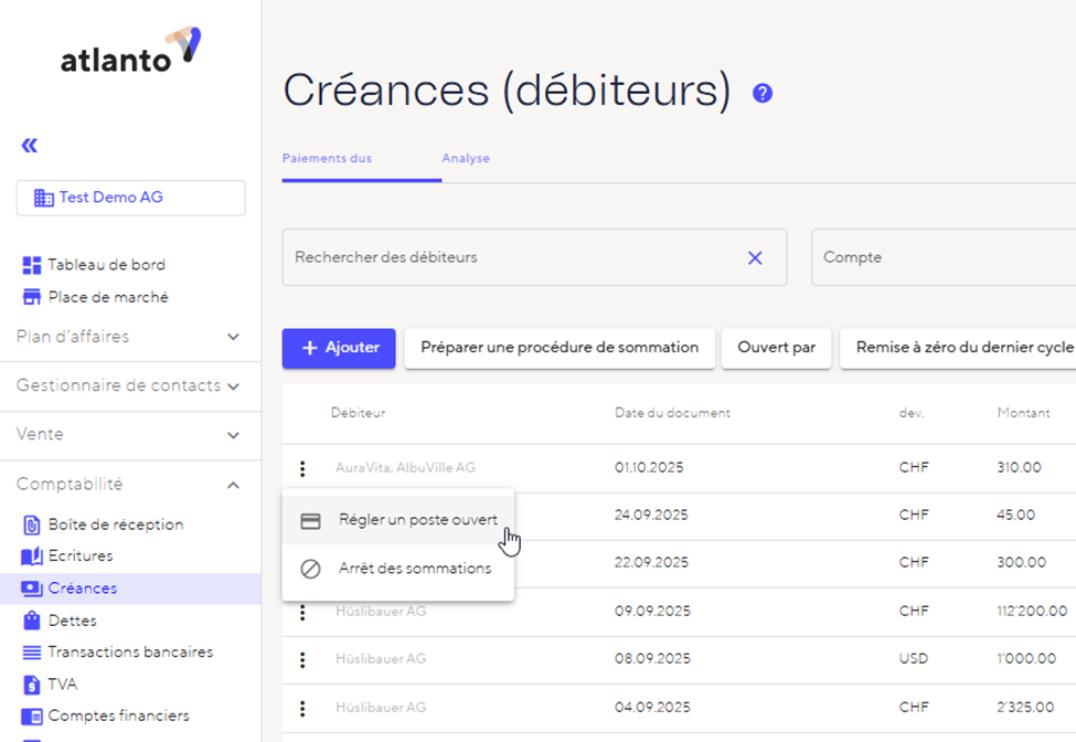 Sous Comptabilité/Créances, sélectionnez directement la créance correspondante, puis choisissez « Régler un poste ouvert ».