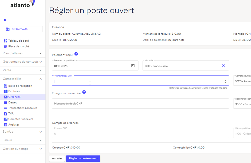Dans le champ « Montant reçu CHF», saisis le montant du paiement partiel. La créance est automatiquement réduite du montant correspondant.