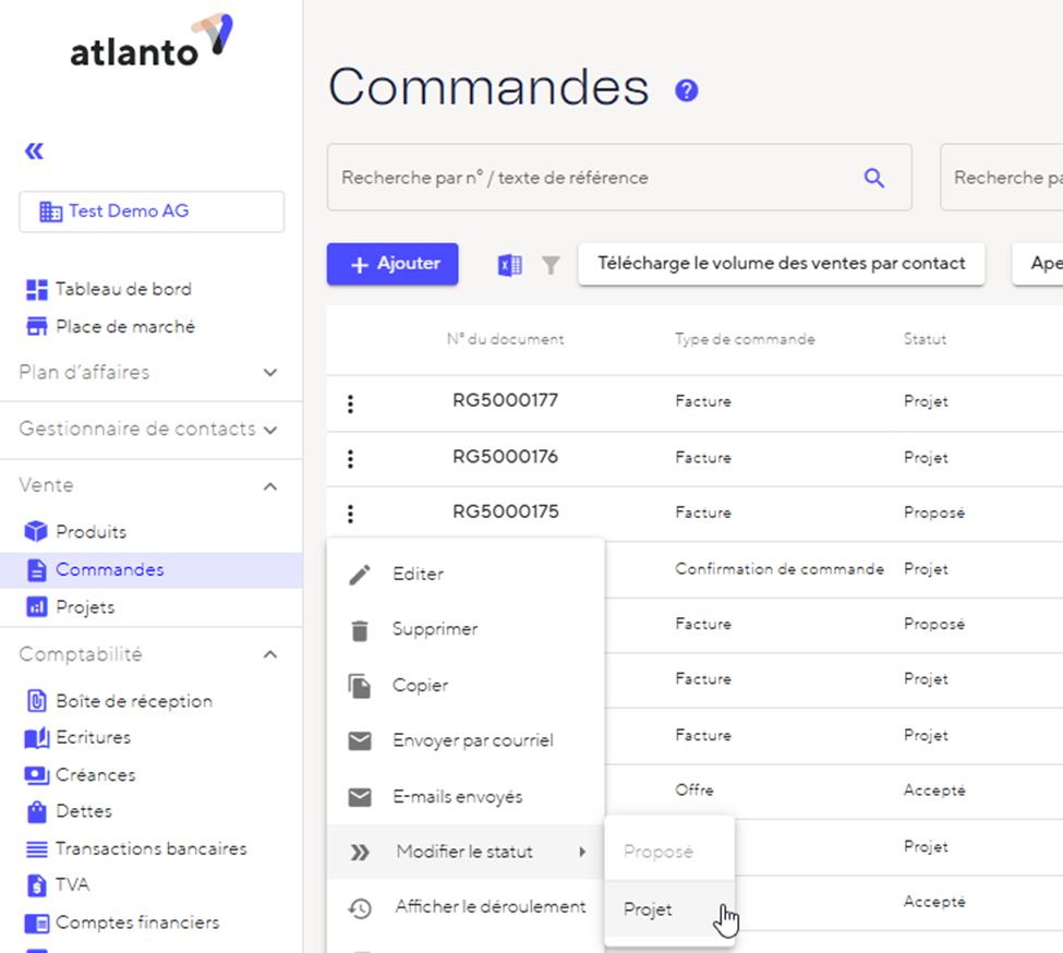 Tu dois réinitialiser le statut sur « Projet ». Ouvre Vente/Commandes et sélectionne les trois points à gauche de la facture correspondante. Sélectionne « Modifier le statut ».