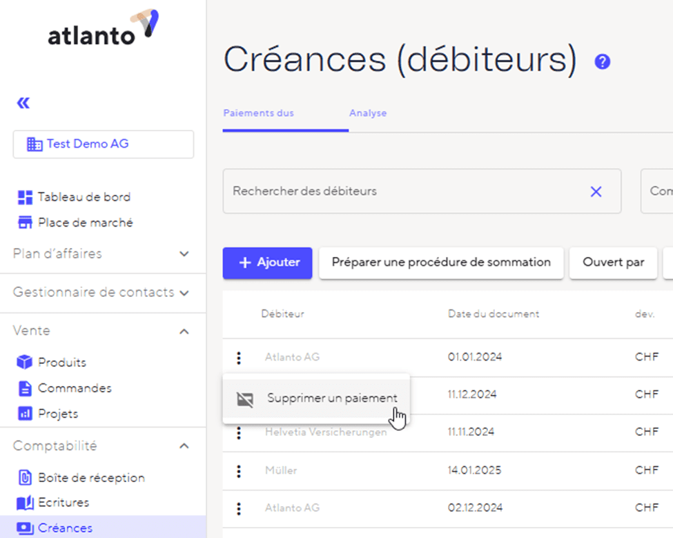 Si tu as déjà enregistré un paiement pour la créance (via les mouvements bancaires ou manuellement via « Régler un poste ouvert »), tu dois tout d’abord supprimer le paiement. Tu peux ensuite modifier à nouveau le statut de la facture.
