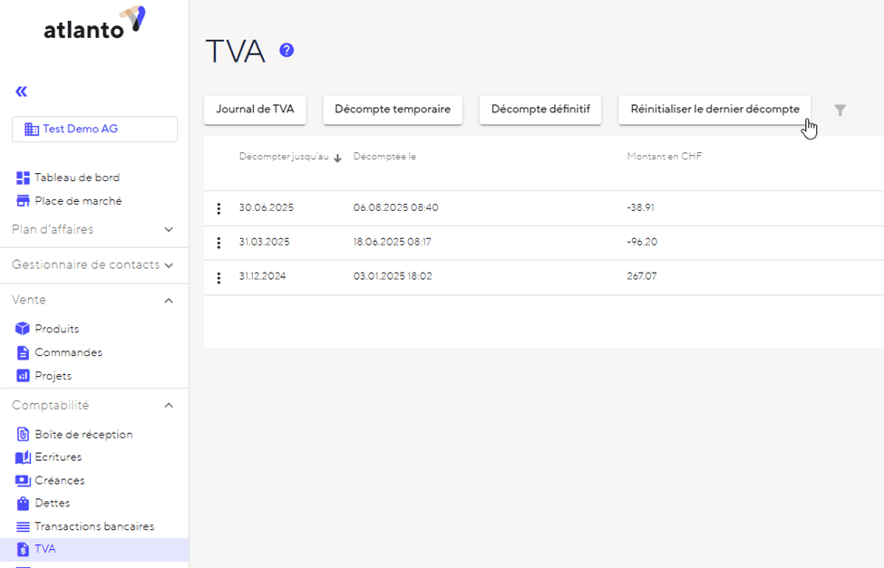 Si la période de TVA de la date concernée est déjà clôturé, tu dois la réinitialiser. Pour ce faire, visite dans Comptabilité/TVA et sélectionne « Réinitialiser le dernier décompte ».
