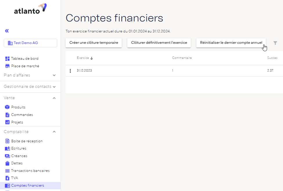 Si l’exercice comptable de la date de la facture est déjà définitivement clôturé, tu dois le réinitialiser. Pour ce faire, allez dans Comptabilité/Comptes financiers et sélectionne « Réinitialiser le dernier compte annuel ».