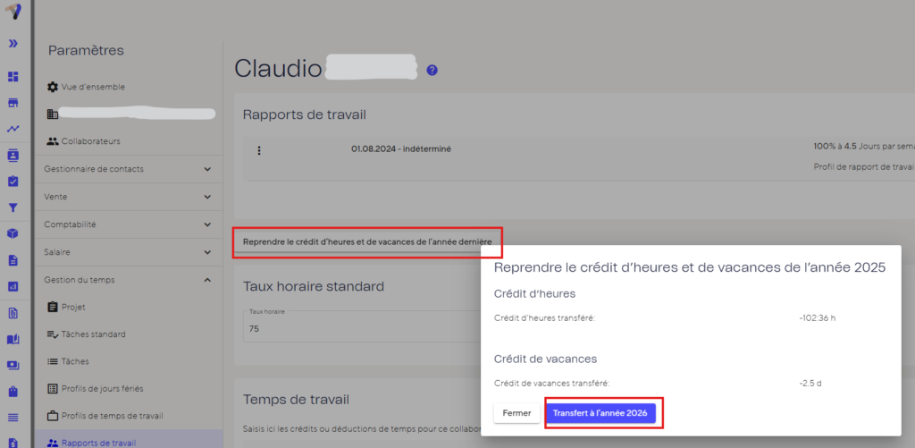 Afin que les soldes de vacances et de temps de l’année précédente soient repris correctement, ils doivent être saisis manuellement pour chaque collaborateur au début de la nouvelle année. La reprise s’effectue directement dans le profil du collaborateur concerné.